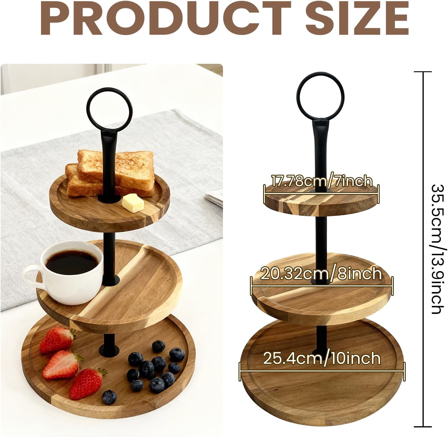 Size:Tray diameter: 10 inches, 8 inches, 7 inches. Tray thickness 0.59 inches / 1.5 cm, distance between trays 4.72 inches / 4.72inches / 4.33 inches, overall height: 13.9 inches