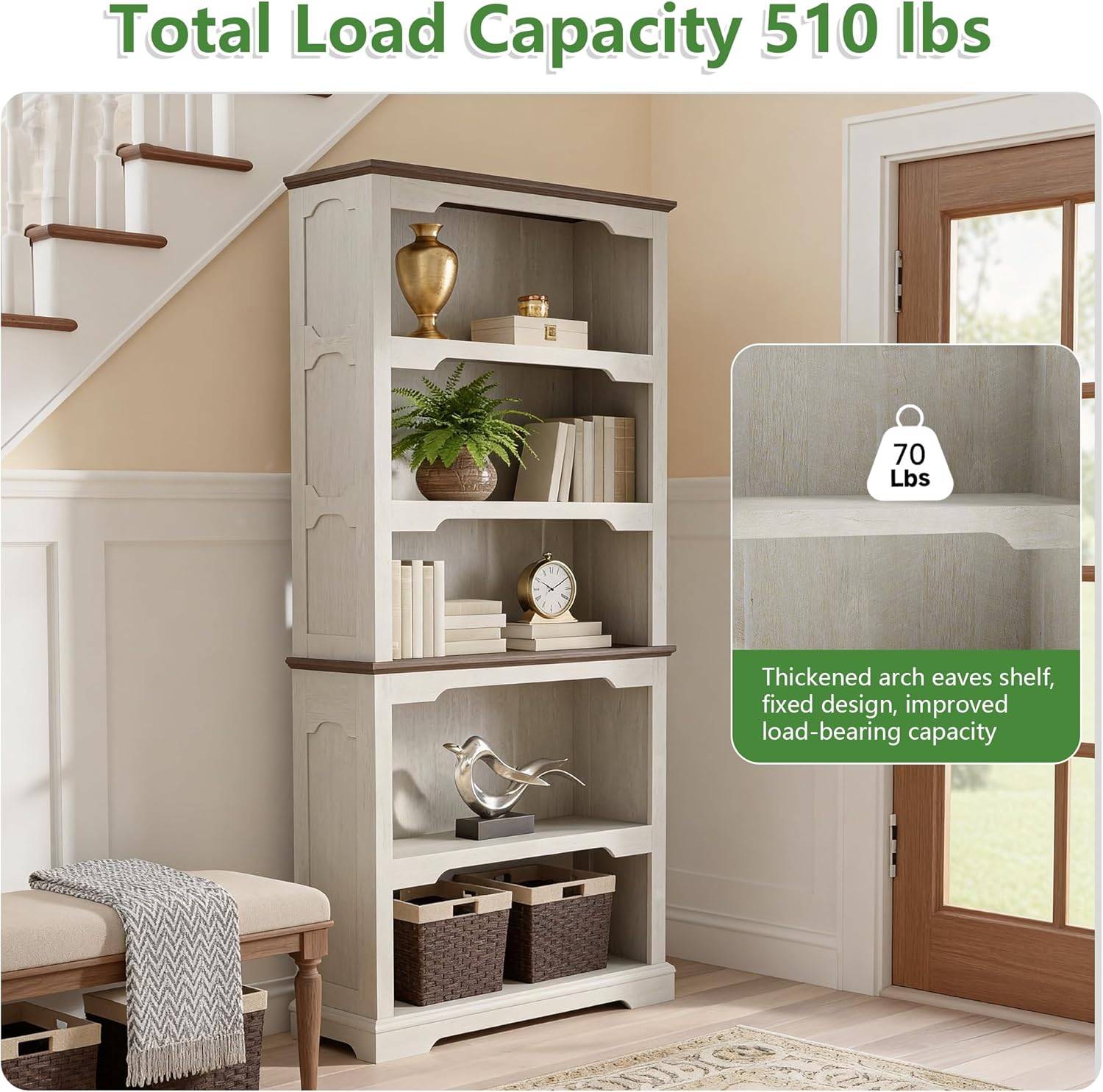 2 reviews for 70 Inch Farmhouse Bookcase, Distressed White and Walnut Two-Tone Shelves, 5 Tier Bookshelf with Arched Trim, Living Room Storage Cabinet Unit, 31.5×11.8 Inches (Off White & Walnut, Open Shelf)