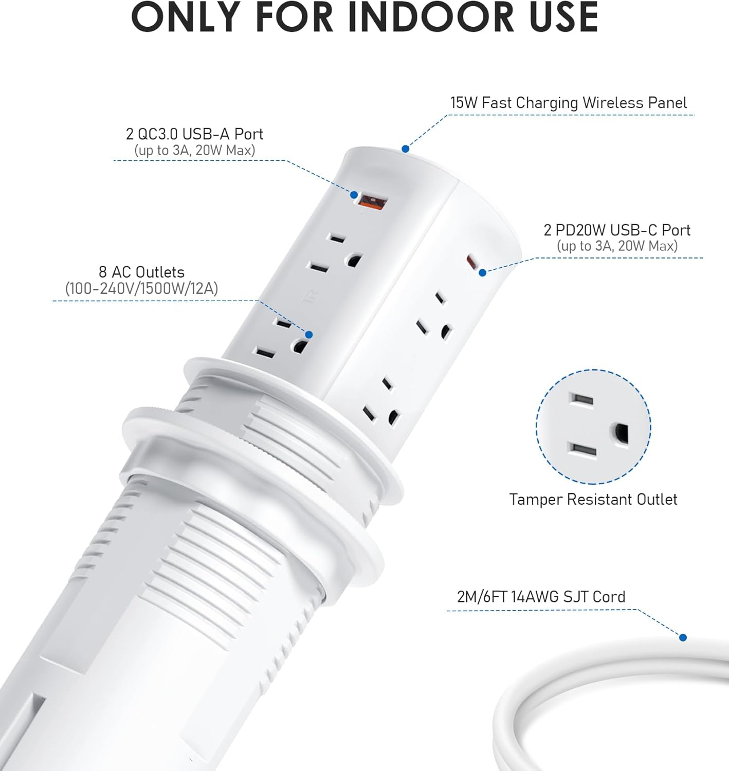 This popup outlets countertop features 8 grounded 3 prong AC outlets, 2 USB-C and 2 USB-A ports(single usb port output: 20W power delivery) on the side, 15W max fast wireless charger on the top. It charges 13 devices at a time, provides you multiple charging options.