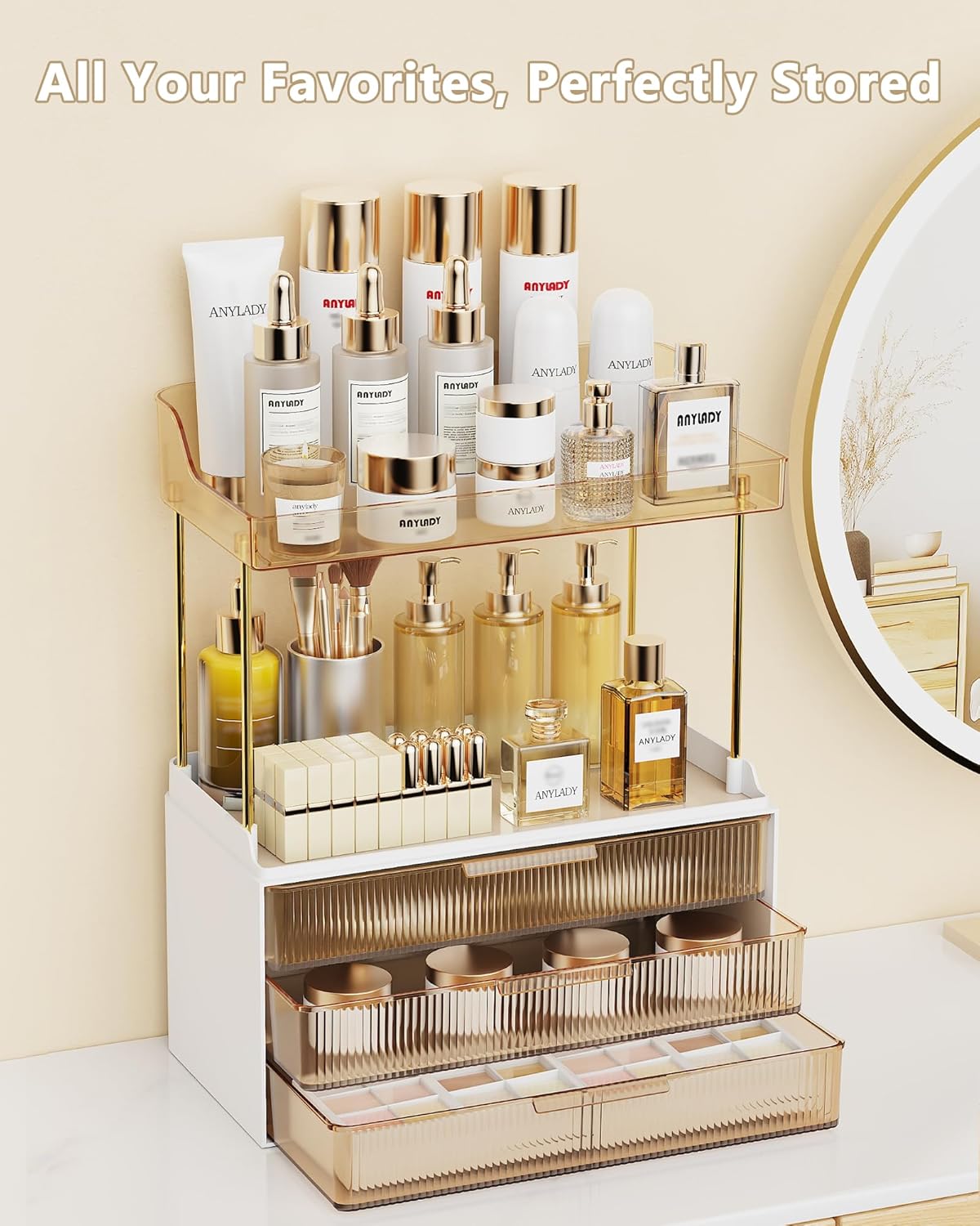 This 3-tier and 3-drawer bathroom organizer is exactly, I bought it from my wife and she loved it. The drawers slide smoothly and are ideal for storing small items such as lipsticks, jewelry and samples of skin care products, while the upper levels provide enough space for perfumes, lotions and everyday essentials. The design is elegant and modern, so it looks elegant on the bathroom countertop. It’s sturdy, easy to clean and contains more than you expected without taking up too much space. Really essential for anyone who wants a tidy and elegant way to store makeup and skin care