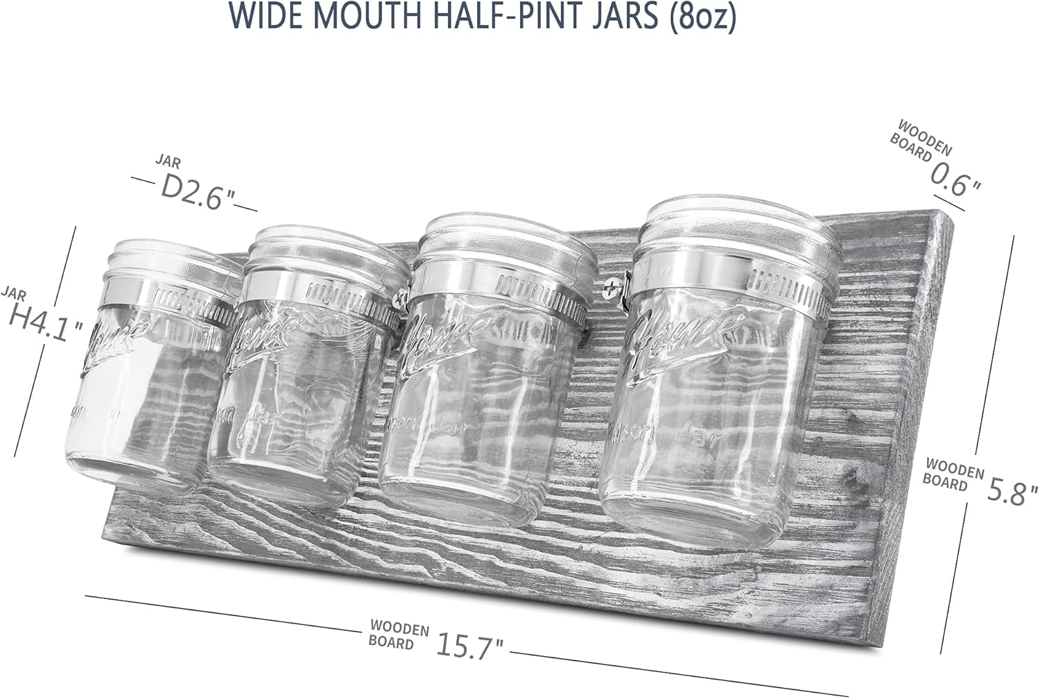 EASY TO INSTALL – Farmhouse organization decor comes with 2 keyhole slots routed into the back for mounting flat against the wall. Half pint wide mouth jars are easily removed for cleaning just using a couple of twists with a flat tip screwdriver loosens the clamps, and jars can slide right out. Nails and screws are not included