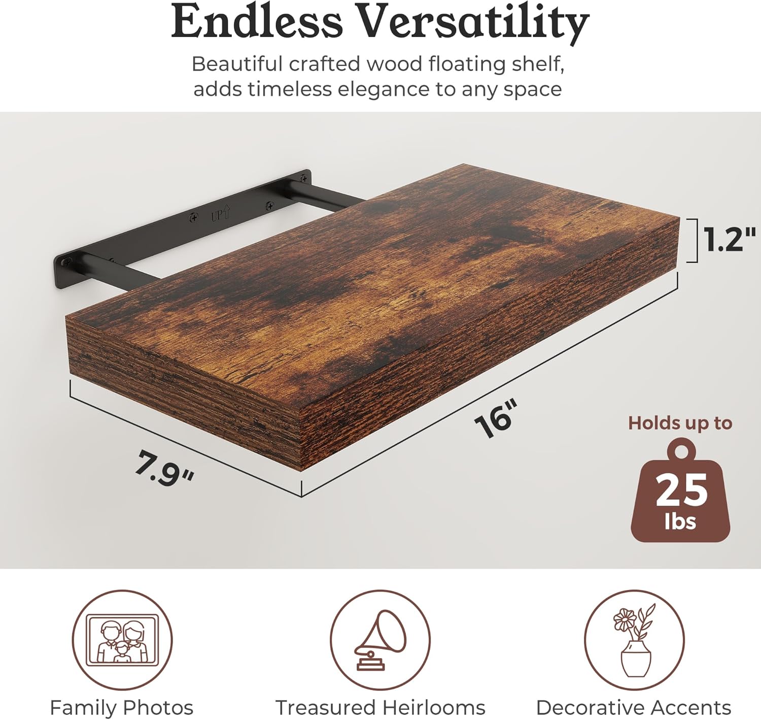8 reviews for Floating Shelves for Wall, 7.9″ Deep Wall Mounted Wood Shelves for Bathroom, Bedroom, Living Room, Kitchen, Hanging Shelf for Books/Storage/Room Decor (Brown, 16″)