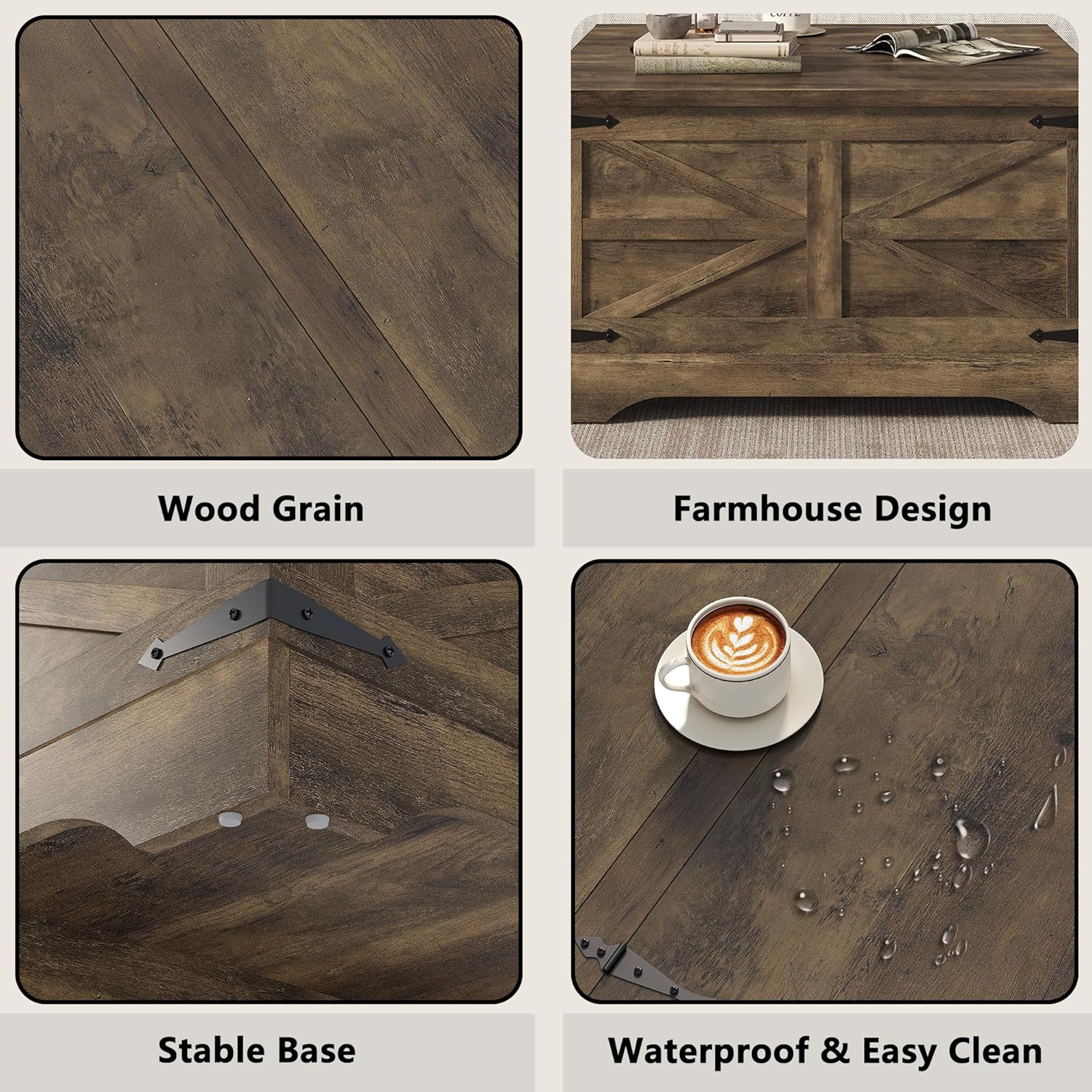 Lift Top Square Coffee Table: The tabletop effortlessly rises from 18.1″ to 23.8″, transforming your farmhouse coffee table into a floating workspace or dining area.Meet both functionality and practicality