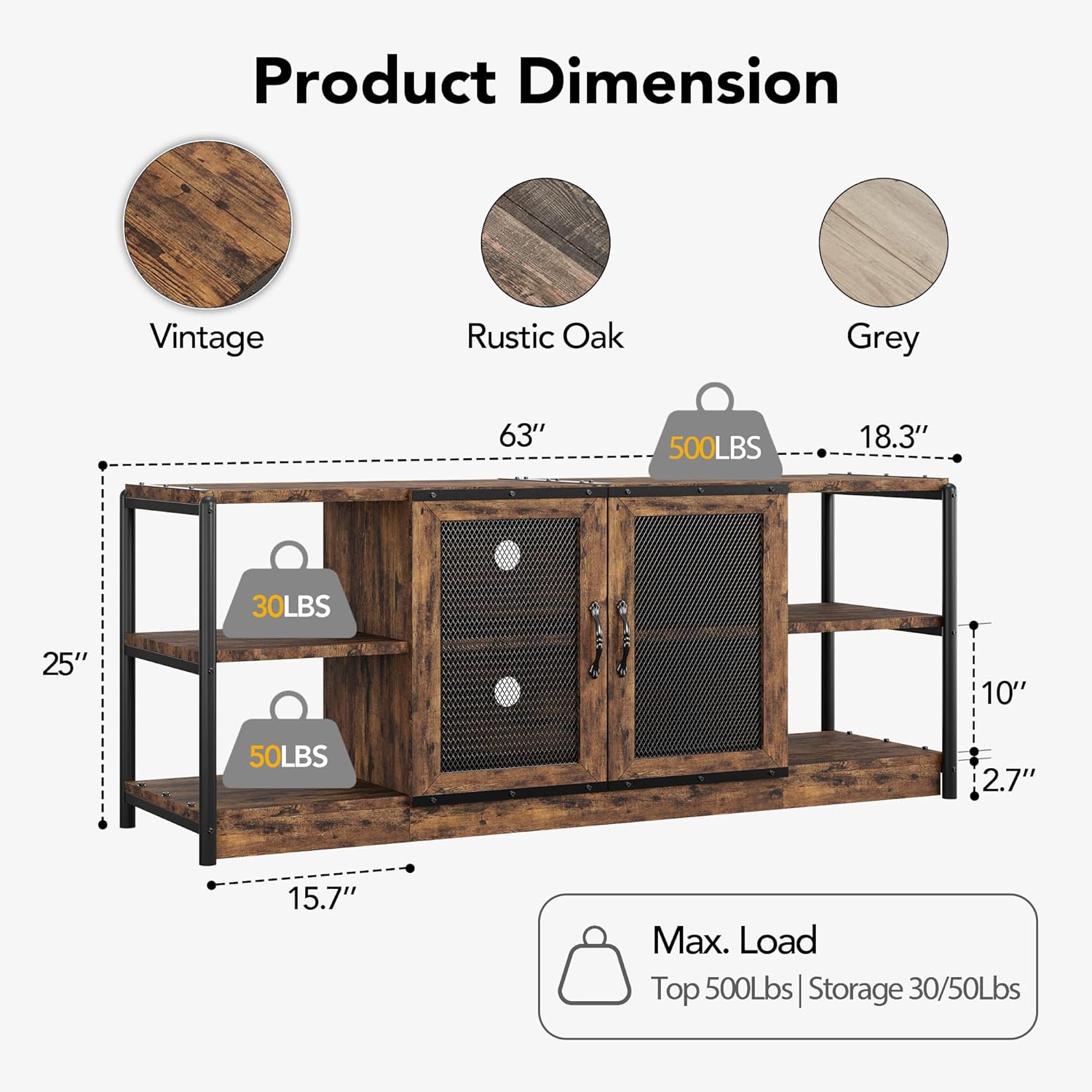 Ample Storage Space: Measuring 63″L x 18.3″W x 25″H overall, this TV stand offers generous storage across 6 compartments. Allowing you to customize the storage space according to your needs. Perfect for the needs of the industrial style home