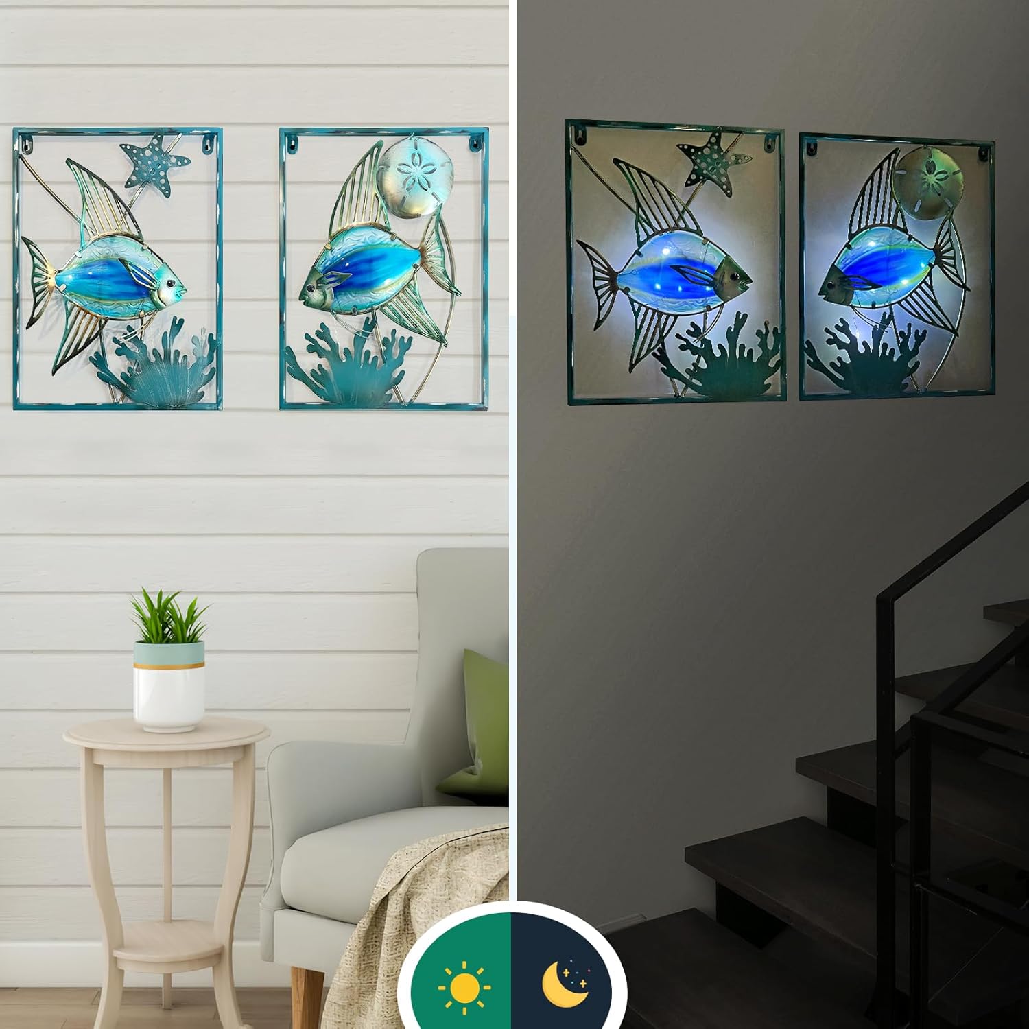 10 reviews for LIFFY Metal Fish Wall Decor with Frame-Outdoor Wall Art, Wall Decor with LED Fairy Lights, Fish Glass Art Wall Sculpture for Patio,Beach,Garden,Yard,Pool,home gift(2pcs, Blue)