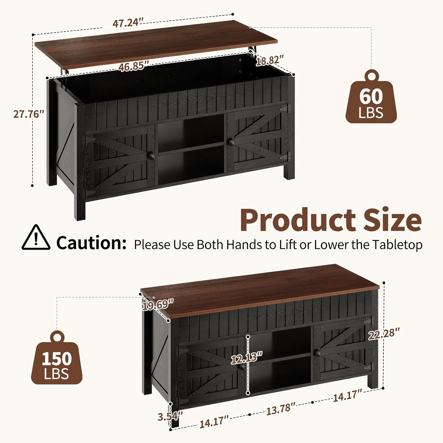 【Built to Last】This rustic coffee table features sturdy legs and a spacious tabletop, paired with a well-made steel lifting mechanism for durability. The black coffee table ensures stability with a load capacity of 150lbs when lowered and 60lbs when the tabletop lifts up. The center table for living room is built for daily use