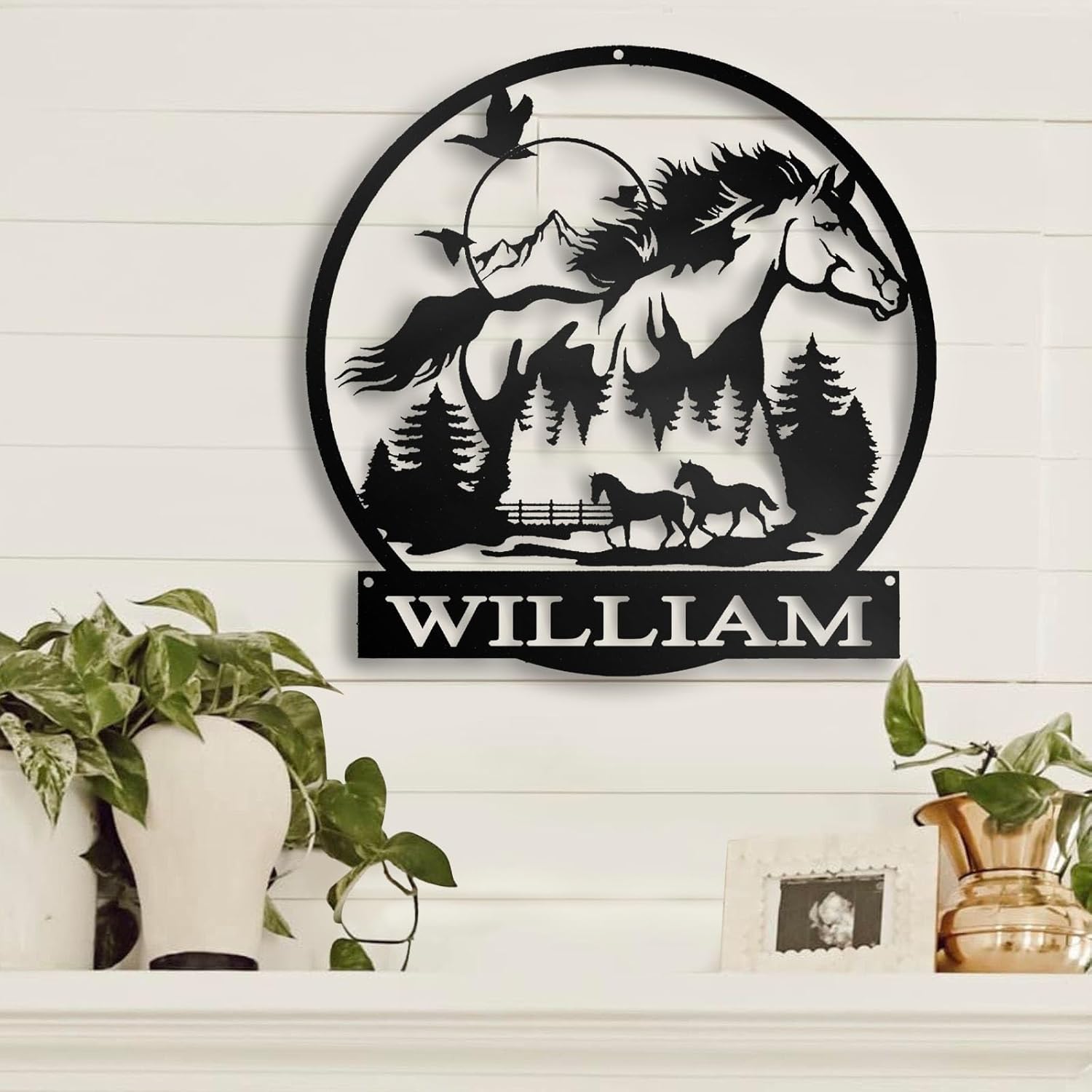 Custom metal farmhouse sign featuring a beautiful western design, perfect for horse ranches