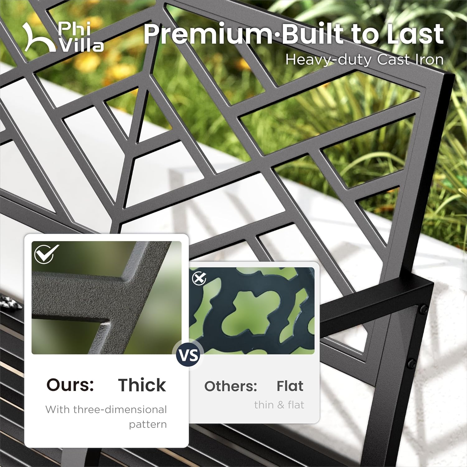 8 reviews for PHI VILLA 43 Inch Cast Iron Steel Frame Outdoor Garden Bench, Patio Furniture Chair Bench w/Line Pattern Design Backrest, Slatted Seat for Park, Yard, Porch – Black