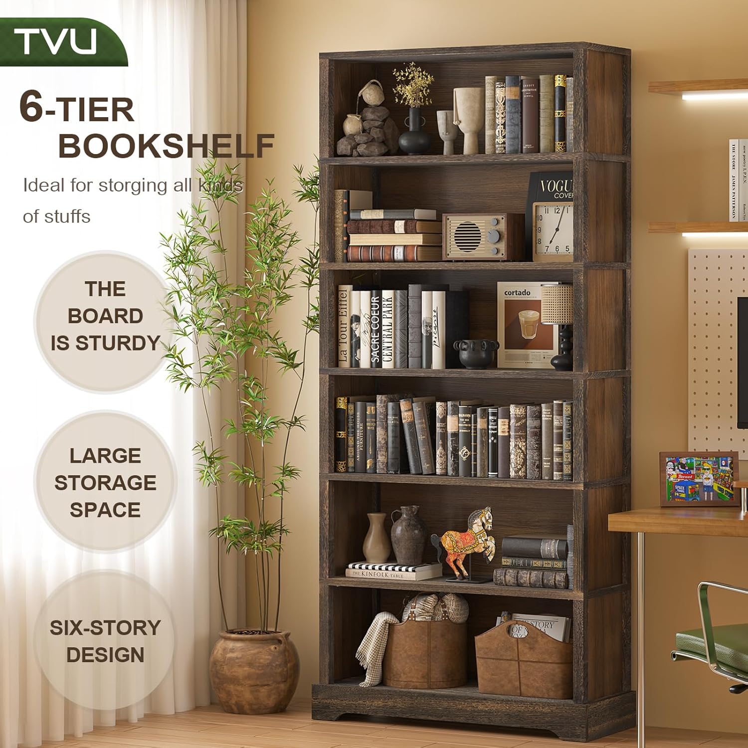 【Versatile Usage Scenarios】This 6-tier wood bookshelf measures 77.2″H x 31.5″W x 11″D; the tall bookshelf is suitable for study, bedroom, living room, office and other scenarios, and can be used to store your books, photo albums, artworks and CDs, meeting your personalized storage needs.