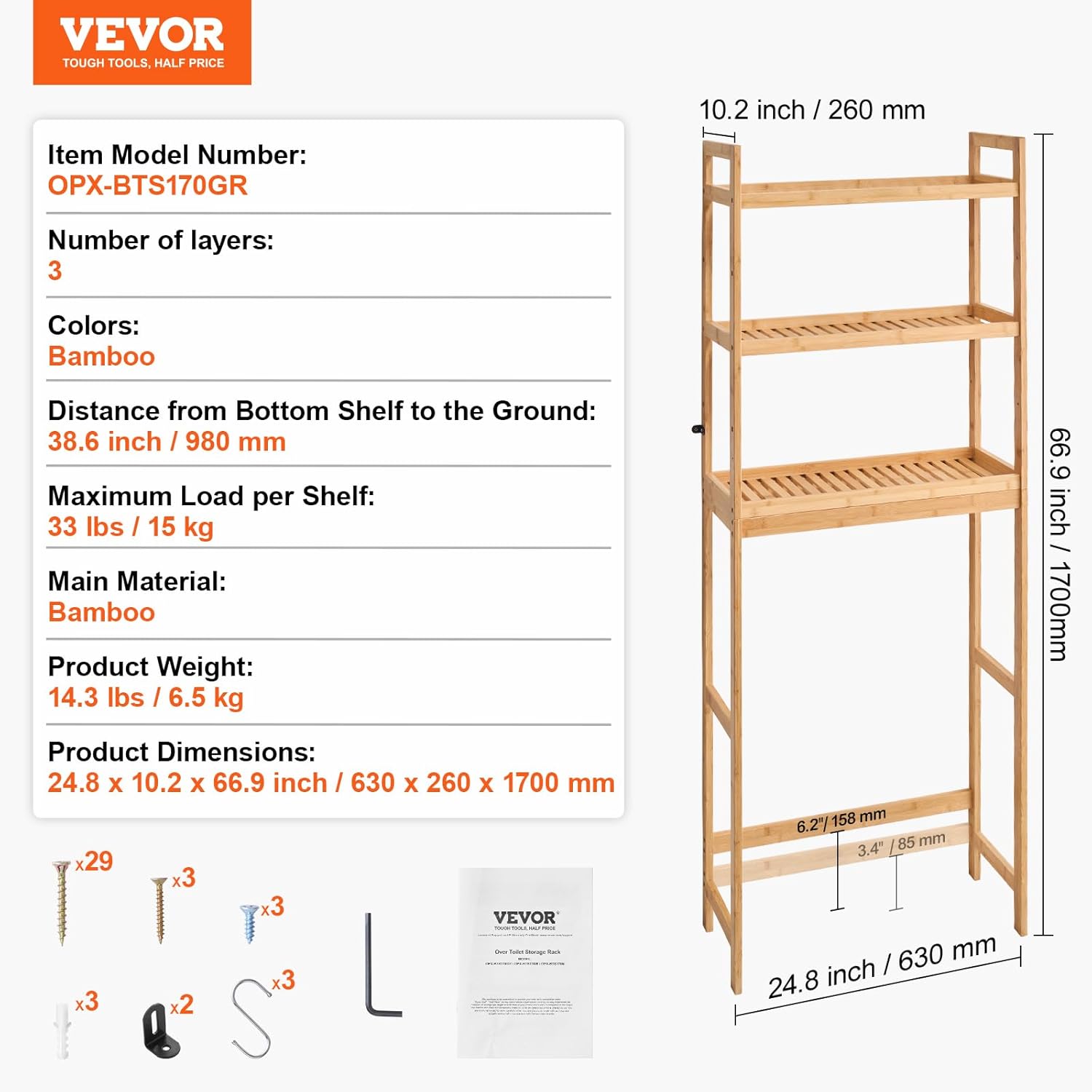 13 reviews for VEVOR Over The Toilet Storage, 3-Tier Adjustable Over Toilet Bathroom Organizer, Bamboo Storage Shelf Rack with 3 Hooks, Freestanding Easy Assembly Laundry Space Saver, Fit Most Toilets