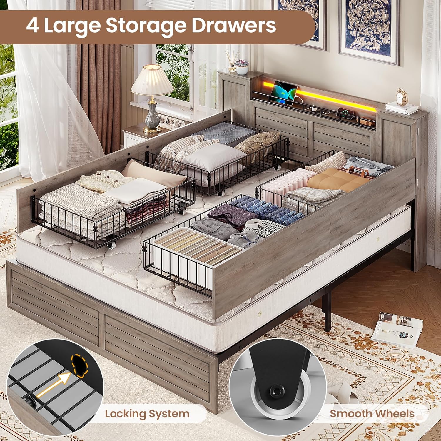 【4 Large Storage Drawers】Maximize every inch of your bedroom with 4 large-capacity under-bed drawers designed for effortless organization! Each deep, sliding drawer glides smoothly on 4 wheels, offering access to store bulky items. Ideal for tight spaces, dorm rooms, or family homes, these drawers keep clutter hidden yet within reach. No handle design maintains the bed’s rustic charm while blending seamlessly into any décor.