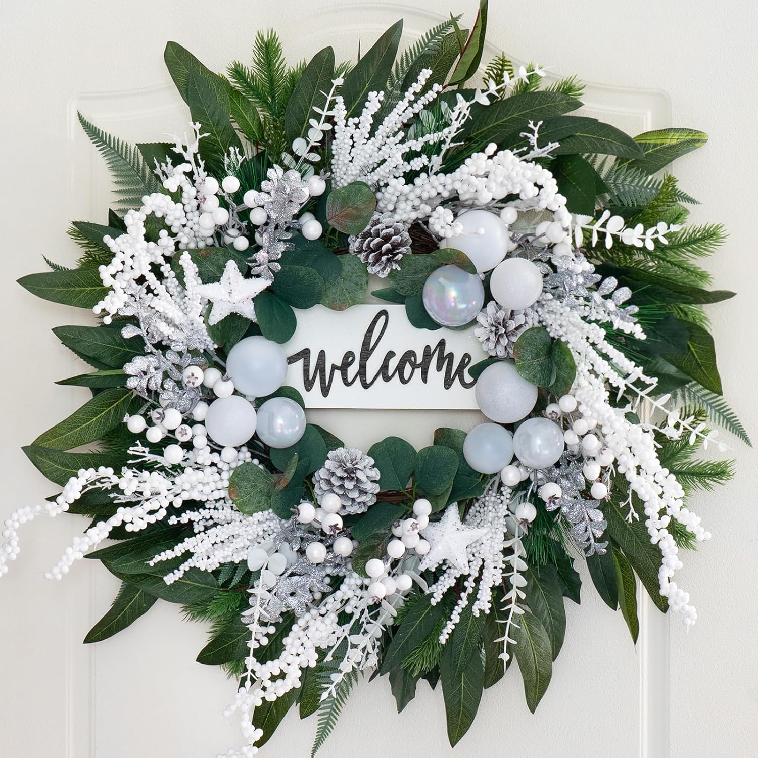 8 reviews for Winter Wreaths for Front Door 24 Inch Winter Door Wreath with White Balls and Silver Berries, Festive Holiday Decor for Indoor and Outdoor, Seasonal Winter Home Decoration