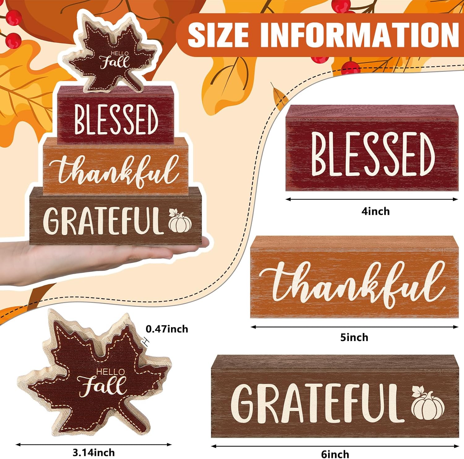 Size Details: available in three sizes 3.94 × 1.77 × 1.38 inches, 4.92 × 1.77 × 1.38 inches, and 5.91 × 1.77 × 1.38 inches, these wooden blocks can be arranged together or separately to fit various spaces; The size of the decorations makes them versatile, suitable for beautiful tables, mantels, or shelves without overwhelming the space; These fall wooden tray decorations create visual interest and dimension, making them ideal as centerpieces or focal points
